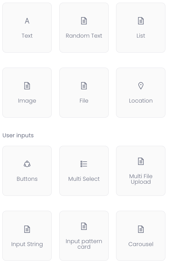This guide provides an overview of the most common bot response types, from simple text and images to interactive elements like buttons, input fields, carousels, and file uploads.