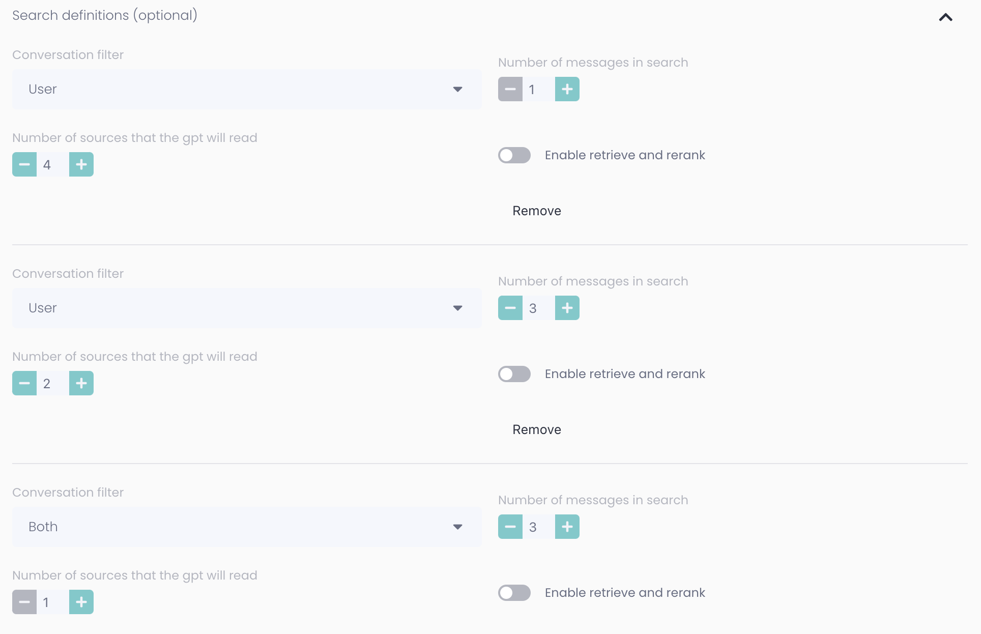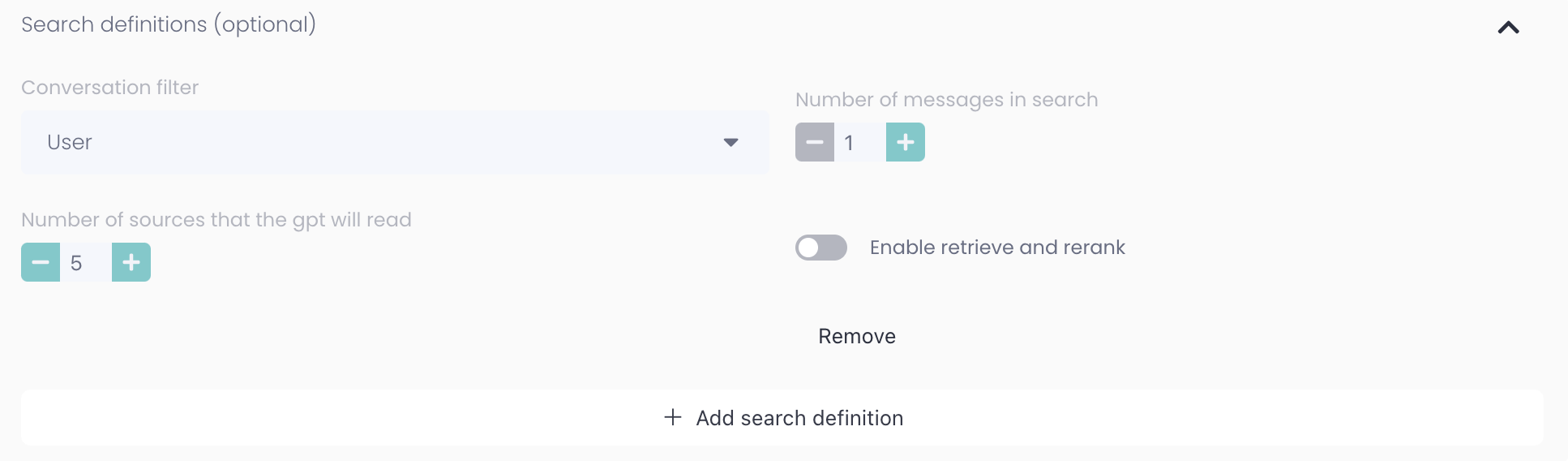 It's generally best to mix different search definitions to get the best combination of sources. The example below shows a setting that will focus on sources from the user's last message but some sources from previous messages from both the user and the assistant.
