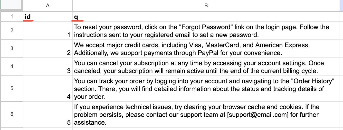 In the example below the column that could be used as an ID is called id. The column to be used for finding answers is called q.