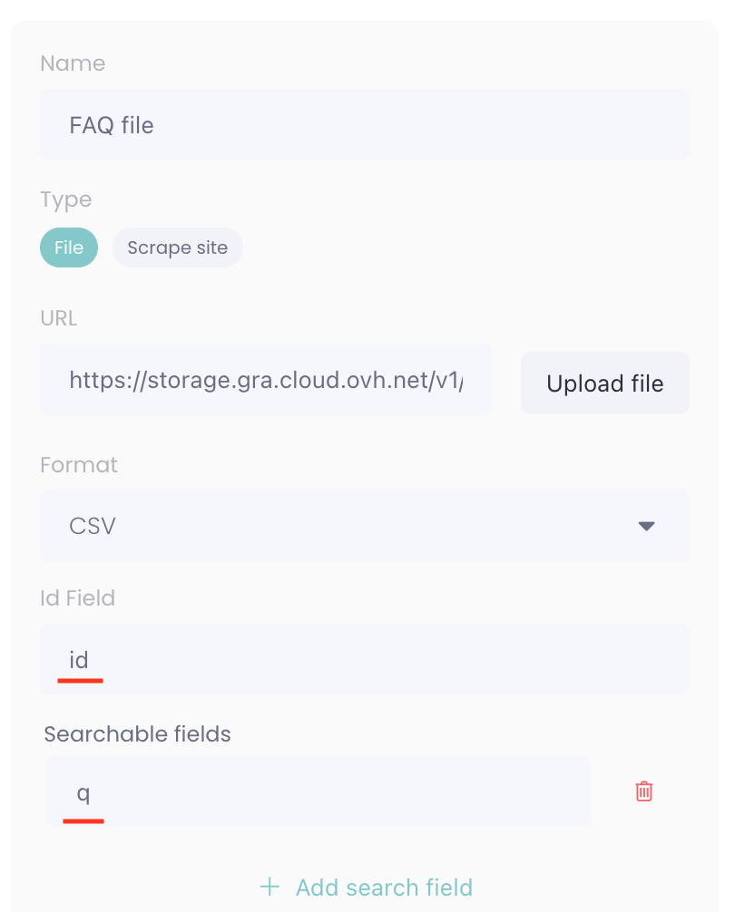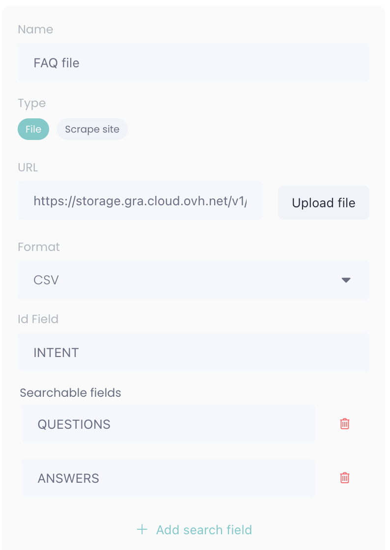- Searchable fields: The columns used by the bot when searching for an answer.