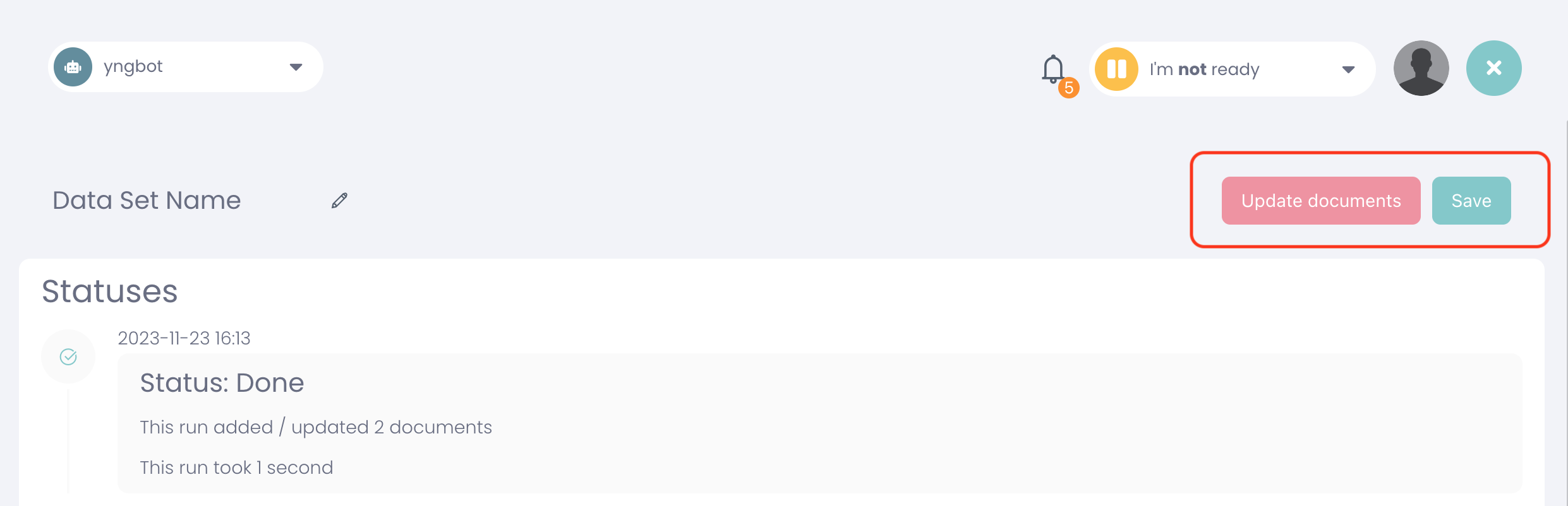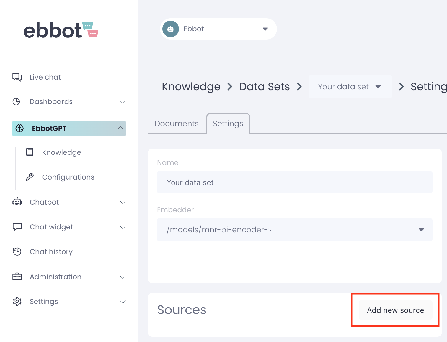 When you're done setting up your new data source you need to scroll up to the top of the page and click on save. If you want the new source to be imported to your data set you also need to click on Update documents.