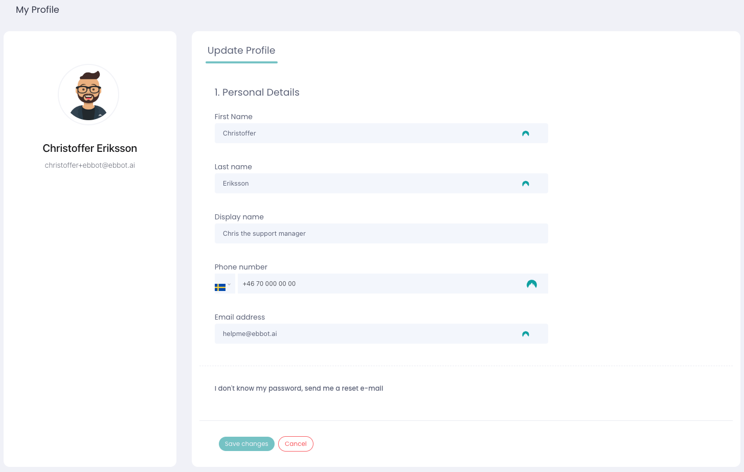 Profile settings When you want to update your profile settings, simply click on your profile in the upper right corner. Here you can make changes to your personal information. Note! The Display name is the name your end users will see.