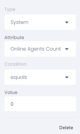 Set the rule: 'online_agents_count' equals '0'.